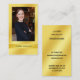 Moderne, minimale, aber üppige und sehr elegante Visitenkarte mit individuellem Foto und Namen auf glänzenden goldenen Hintergründen, mit Vorlagen für Namen, Titel, Handynummer, E-Mail-Adresse, Website-Adresse und Straße / Postanschrift und Bürotelefonnummer auf der Rückseite, auf einem glänzenden goldenen Hintergrund. Großer Blick für selbstständige Fachleute wie Verkäufer, Innenarchitekten, Redakteure, Schriftsteller, etc., und auch für Fachleute wie Anwälte und Finanzberater, die ein stilvolles, scharfes, üppiges, aber minimalistisches Design suchen.