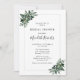 Eine üppige Grünanlage aus smaragdgrünen und staubigen grünen Blätter, Farnen und Eukalyptus zeichne auf unserer wunderschönen Brautdusche-Einladung die Aufmerksamkeit auf den Text. Auf der Rückseite der Karte befindet sich ein staubiger grüner Schatten, der sich im Blätterdach des Bouquets befindet. Alle Beispieltexte können mit eigenen Angaben auf der Personalisierungsvorlage leicht überarbeitet werden.