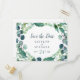 Diese üppige Vegetation und Eukalyptus Save the Date Postcard ist ideal für eine elegante Hochzeit im Hinterhof. Das moderne botanische Design besticht durch herrliche Aquarellblaue Eukalyptusbäume und grüne Blätter.