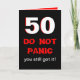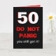 Diese lustige 50. Geburtstagskarte kennzeichnet großen 50 im Weiß, das im Rot auf einem schwarzen Hintergrund umrandet wird. Unter den 50 sind die Wörter "IN PANIK VERSETZEN NICHT" geschrieben in eine Panik, die Schriftart schaut. Dann erscheinen die Wörter ", das Sie sie noch" got. Innerhalb ist ein lustiges sich entfernen von der Front, um eine 50. Geburtstagskarte des lustigen Meilensteines zu machen. Copyright Kathy Henis