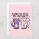 Feiern Sie Ihre besondere Bindung mit dieser skurrilen "Danke fürs Sein mein Partner"-Karte! Dieses spielerische Design mit zwei bezaubernden Cartoon-Katzen eignet sich hervorragend, um an Geburtstagen, dem Valentinstag, Anerkennung zu zollen oder einfach nur jemandem den Tag zu erleichtern. Teilen Sie ein Lachen und lass Ihre Lieben wissen, wie viel sie Ihnen gemein mit dieser charmanten und lustigen Karte!
