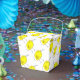 Lustige gelbe Cartoon-Vögel Kritzelzeichnung Geschenkschachtel