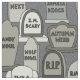 Werden Sie zu etwas gespenstischem Spaß mit den Halloween-Grabsteinen auf diesem Gewebe fertig. Grabsteine haben Namen wie "I.M. Scary", "Herbst Webb", "SüßigkeitGhoul", "Wolf-Heulen", Jack O. Lantern" und mehr, in den Schatten des Graus. Ursprüngliches Kunst © Anne Coffey.