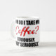 Niedliche Kaffee-Tasse, die "sagt, wie I meinen Kaffee ernsthaft sehr ernst" im schwarzen und roten Text nehmen.