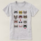 Einiges unterschiedliche Art der niedlichen und lustigen Katzen mit Gläsern, die mit den schwarzen, roten, rosa und aquamarinen Rahmen sind. Einige von ihnen haben Bogen-Krawatten in der schwarzen und roten und roten Krawatte. Der Hintergrund hat sehr hellgraues geometrisches Muster in der sehr hellen Beige. Die Rückseite der T-Shirts hat ein Bild einer schwarzen Krawatte und der Sonnenbrillen. Dieses ist eine digitale Illustration.