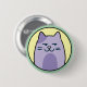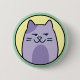 Niedlicher runder Knopf/Anstecker einer lila Cartoon-Katze, die einen seitlichen Blick auf gelbem und grünem Hintergrund zeigt.