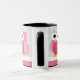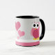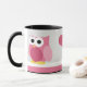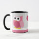 Niedliche Tasse mit rosa Eulen und Herzen in der Mitte über den hellgrauen und weißen, rosa und schwarzen Streifen an der Unterseite.