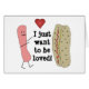 Ein Würstchen, das zu einem Würstchenbrötchen mit Wort-Sprichwort läuft, das, ich gerade will geliebt zu werden, macht eine lustige Cartoonkarte.