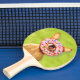 Lustiger Chihuahua-Hund mit besprühen Krapfen auf Tischtennis Schläger