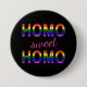 Süßer und lustiger Knopf, mit mutigem und dekorativem Text "HOMO-süßer HOMO", ein Wort pro Linie. Erste und letzte Show-Hauptstadtsbuchstaben füllten mit dem homosexuellen Symbol, die Regenbogenflagge. Der zentrierte "Bonbon" ist etwas winklig und kann die justierte Farbe sein.