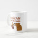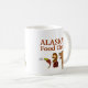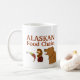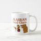 Diese lustige Alaska-Andenken-Tasse sagt alaskische Nahrungsmittelkette. Sie hat einen Cartoonmoskito, Sockeyelachse, den Mann, der ein Holzfäller-Shirt tragen, und den Bären und ganz isst das folgende.