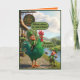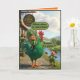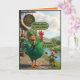 Lustiges St. Patrick's Day-Kartendesign bringt irischen Schabernack im kühnen 3D-Pixar-Stil zum Leben. Ein entzückter Leprechaun reitet stolz auf einem riesigen grünen Hahn vor dem "Craic Inn", während ein anderer Leprechaun mit einer Angelrute daneben steht und von der Größe und Farbe des prächtigen Hahns absolut verblüfft ist. Es ist spielerisch, farbenfroh und voller irischem Humor, der den St. Patrick's Day unvergesslich macht.