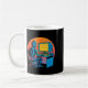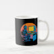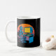 Lustiger Retro-Roboter codiert Computerbildschirm Kaffeetasse