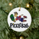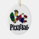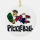 Alberner lustiger springender pickleball Typ trägt blaue Kurzschlüsse und blaues und rotes Shirt in diesem ursprünglichen Kunstentwurf des Spaßes.