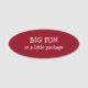 Lustiger Büroname etikettiert mit humorvolle Phrase großem Spaß in einem kleinen Paket mit weißer Beschriftung auf einer mutigen und roten Abzeichenfarbe des Spaßes.