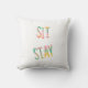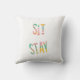 Funny Text Kissen Spaß sitzen bleibe in farbigen Buchstaben auf weißem Hintergrund für whimsical Stil Wohngestaltung.