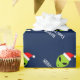 Lustiges Weihnachtsmann-alien Weihnachtsverpackungspapier für Mannfrauen und -kinder. Grünes alien Haupt, ein Weihnachtsmannmütze giftwrap tragend personalisiert mit seaspns Gruß und Namen. Lustiger UFO-Geschenkverpackungsentwurf für Feiertag stellt sich dar. Machen Sie ein für Sohn, Enkel, neues Baby, Enkelkind. Außerirdische Lebenraum-Cartoonillustration für Kinder (Jungen/Mädchen) und Erwachsene.  Kundenspezifisches Farbhintergrund-IE-Blau.