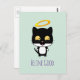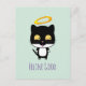Eine Postkarte mit einem themenorientierten Wortspiel der lustigen Katze. Sagt "katzenartiges gutes". Eine niedliche Schwarzweiss-Engel Kittykatze mit einem goldenen Halo über ihrem Kopf, gezeichnet in der Cartoonart.
