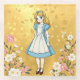 Das ist ein hübscher Luxe Alice im Wunderland Untersetzer. Das Bild zeigt Alice in der Mitte mit einem blauen und weißen Pinavorboden. Es gibt Blume auf beiden Seiten und der Hintergrund ist goldgelb. Der Untersetzer ist ein Untersetzer aus viereckigem Glas. Der Untersetzer ist Geschirrspüler-sicher. Das Design entstand aus generativer Kunst.