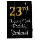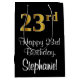 Dieses stilvolle, raffinierte und luxuriöse Geschenktütendesign mit Geburtstagsdesign weist eine große Ordnungsnummer "23." auf, die einen vergoldeten Stil von Imitation/Imitaten aufweist, sowie die Geburtstagsgrüßbotschaft "Happy 23. Geburtstag" und einen benutzerdefinierten Empfängernamen in einem Schriftart im Skriptstil. Der Hintergrund ist schwarz. Eine Geburtstagsgeschenktüte wie diese könnte eine lustige Art sein, ein Geschenk oder Geschenk zum Feiern eines dreiundzwanzigsten Geburtstags zu verpacken. [~Z0000514]