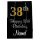 Dieses stilvolle, raffinierte und luxuriöse Geschenktütendesign mit Geburtstagsthema weist eine große Ordnungsnummer "38." auf, die ein vergoldetes Farbmuster von Imitation/Imitaten aufweist, sowie die Geburtstagsgrüßbotschaft "Happy 38. Geburtstag" und einen benutzerdefinierten Empfängernamen in einem Schriftart im Skriptformat. Der Hintergrund ist schwarz. Eine Geschenktasche wie diese kann benutzt werden, wenn man ein Geschenk oder Geschenk zu Ehren des 38. Geburtstages von jemandem gibt. [~Z0000514]