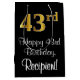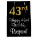 Dieses luxuriöse, elegante und raffinierte Geburtstagsgeschenke-Design verfügt über eine große Ordnungsnummer "43." mit einem Imitat/Imitation von vergoldetem inspiriert Erscheinungsbild, die Geburtstagsgrüßbotschaft "Happy 43. Geburtstag" und einen anpassbaren Empfängernamen in einem skriptartigen Schriftart. Der Hintergrund ist schwarz. Eine Geschenktasche wie diese kann verwendet werden, wenn Sie ein Geschenk oder Geschenk zu Ehren von jemandem 43. Geburtstag. [~Z0000514]
