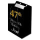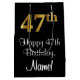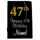 Dieses raffinierte, elegante und stilvolle Geschenktütendesign weist eine große Ordnungsnummer "47." auf, die ein Imitat/eine Imitation mit goldinspiriert Farbverlaufsmuster aufweist, sowie die Geburtstagsgrüßbotschaft "Happy 47. Geburtstag" und einen benutzerdefinierten Empfängernamen in einem skriptartigen Schriftart. Der Hintergrund ist schwarz. Eine elegante Geschenktasche wie diese kann verwendet werden, wenn ein Geschenk oder Geschenk zu Ehren von jemandem siebenundvierzig Geburtstag. [~Z0000514]