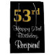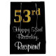 Dieses stilvolle, elegante und luxuriöse Geschenktütendesign mit Geburtstagsdesign weist eine große Ordnungsnummer "53." auf, die ein Imitat-/Imitationsmuster mit goldinspiriert Farbverlaufen aufweist, sowie die Geburtstagsgrüßbotschaft "Happy 53. Geburtstag" und einen benutzerdefinierbaren Empfängernamen in einem skriptartigen Schriftart. Der Hintergrund ist schwarz. Eine elegante Geschenktasche wie diese kann benutzt werden, wenn man ein Geschenk oder Geschenk zu Ehren eines 50. Geburtstages von jemandem gibt. [~Z0000514]