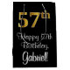 Dieses raffinierte, elegante und luxuriöse Geschenktütendesign mit Geburtstagsgeschenk weist eine große Ordnungsnummer "57." auf, die ein mit Gold inspiriert Farbverlaufsmuster imitiert, sowie die Geburtstagsgrüßbotschaft "Happy 57. Geburtstag" und einen editierbaren Empfängernamen in einem skriptartigen Schriftart. Es hat auch einen schwarzen Hintergrund. Eine Geburtstagsgeschenktüte wie diese könnte eine lustige Art sein, ein Geschenk oder Geschenk für jemanden zu verpacken, der seinen 57. Geburtstag feiert. [~Z0000514]