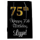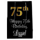 Dieses luxuriöse, stilvolle und raffinierte Geschenksack-Design aus einem Geburtstag mit einer großen Ordnungsnummer "75." mit einem vergoldeten Aussehen von Imitationen/Imitaten, der Geburtstagsgrüßbotschaft "Happy 75. Geburtstag" und einem bearbeitbaren Empfängernamen in einem Schriftart im Skriptstil. Es hat auch einen schwarzen Hintergrund. Eine Geburtstagsgeschenktüte wie diese könnte eine lustige Art sein, ein Geschenk oder Geschenk für jemanden einzupacken, der seinen 75. Geburtstag feiert. [~Z0000514]
