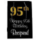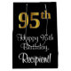 Dieses stilvolle, luxuriöse und raffinierte Geschenktütendesign weist eine große Ordnungsnummer "95." auf, die ein vergoldetes Farbverlaufsmuster von Imitation/Imitaten aufweist, zusätzlich zur Geburtstagsgrüßbotschaft "Happy 95. Geburtstag" und einem personalisierten Empfängernamen in einem skriptartigen Schriftart. Es hat auch einen schwarzen Hintergrund. Eine Geschenktasche wie diese kann verwendet werden, wenn Geschenke umhüllt werden, die jemandem anlässlich seines fünfundneunzigsten Geburtstages gegeben werden. [~Z0000514]