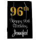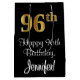 Dieses stilvolle, raffinierte und elegante Geschenksack-Design mit einer großen Ordnungsnummer "96.", die ein vergoldetes Aussehen von Imitationen/Imitaten hat, sowie die Geburtstagsgrüßbotschaft "Happy 96. Geburtstag" und einen editierbaren Empfängernamen in einem Schriftart im Skriptstil. Der Hintergrund ist schwarz. Eine Geschenktasche wie diese kann verwendet werden, wenn Geschenke umhüllt werden, die jemandem anlässlich seines 96. Geburtstages gegeben werden. [~Z0000514]