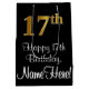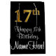 Dieses luxuriöse, stilvolle und elegante Geburtstagsgeschenke-Design verfügt über eine große Ordnungsnummer "17." mit einem vergoldeten Imitat/Imitation-Look, zusammen mit der Geburtstagsgrüßbotschaft "Happy 17. Geburtstag" und einem benutzerdefinierbaren Empfängernamen in einem skriptartigen Schriftart. Es hat auch einen schwarzen Hintergrund. Eine Geburtstagsgeschenktüte wie diese könnte eine lustige Art sein, ein Geschenk oder Geschenk für jemanden zu verpacken, der seinen 17. Geburtstag feiert. [~Z0000514]