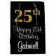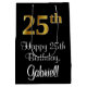 Dieses luxuriöse, elegante und raffinierte Geschenksack-Design mit einer großen Ordnungsnummer "25.", die ein vergoldetes Aussehen von Imitationen/Imitaten hat, sowie die Geburtstagsgrüßbotschaft "Happy 25. Geburtstag" und ein personalisierter Empfängername in einem skriptartigen Schriftart. Es hat auch einen schwarzen Hintergrund. Eine Geschenktasche wie diese kann verwendet werden, wenn Sie ein Geschenk oder Geschenk zu Ehren von jemandem fünfundzwanzig Geburtstag. [~Z0000514]
