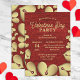 Diese Valentinstag-Party Einladung ist ein Beleg für die Eleganz der Einfachheit. Der reiche, rote Hintergrund, der an luxuriöse Stoffe erinnert, schafft eine warme und einladende Atmosphäre. Die goldene, kursive Schrift, die den Anlass verkündet, strahlt mit einem einladenden Glanz und fügt dem Design eine Touch von Eleganz hinzu. Die Einladung ist mit zarten goldenen Herzen geschmückt, mit juwelenartigen Details geschmückt und fügt dem Gesamtdesign eine romantische Touch hinzu. Die Veranstaltungsdetails werden deutlich in kontrastfarbenen Farben präsentiert, sodass sie leicht lesbar sind. Das Design-Layout ist ausgewogen und harmonisch, wodurch ein ästhetisch ansprechender visueller Effekt entsteht. Jedes Detail auf dieser individuell gestaltbaren Einladung, von der Wahl des Schriftartes bis zur Herzenplatzierung, ist darauf ausgerichtet, Vorfreude und Spannung für eine unvergessliche Valentiner Ansammlung zu wecken.