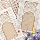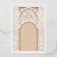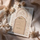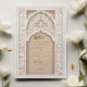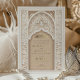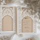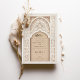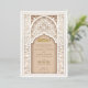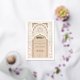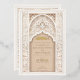 Diese luxuriöse Hochzeitseinladung ist eine perfekte Mischung aus traditioneller islamischer Kunst und moderner Eleganz. Die Vorderseite der Einladung weist ein aufwändiges Gold- und Elfenbeinblumenmuster auf, das den Text in arabischer und englischer Sprache zart umrahmt. Das schöne Bogendesign, mit detaillierten Blumenmotiven und geometrischen Mustern geschmückt, vermittelt ein Gefühl von Pracht und Eleganz. Die Rückseite der Einladung setzt dieses Thema mit einem weichen beigen Hintergrund fort, hervorgehoben durch ein verziertes, geprägtes Blumendesign, das Textur und Tiefe verleiht. Ideal für eine große und elegante Hochzeit, wird diese Einladung sicher einen bleibenden Eindruck auf Ihre Gäste verlassen.