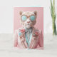Ein stilvoller, weißer Leopard mit einem extravaganten rosa Anzug, der mit Juwelen, Blumendetails und eleganten Dekorelementen geschmückt ist. Die Feline hat eine rautenbespannte rundliche Sonnenbrille und einen pastellfarbenen Bowtie, der Raffinesse und Glamour ausstrahlt.