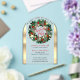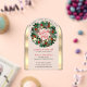 Diese wunderschöne Weihnachtsfeier mit einer Bogenform und goldenen Seitenstreifen ist sehr trendig. Der Kranz ist mit Kiefernzapfen, heiligen, roten und weißen Bausteinen, goldenen Sternen und Schneeflocken dekoriert. Alle Texte sind mit raffinierter Typografie geschrieben und können individuell angepasst werden. Perfekt für ein fröhliches, modernes Weihnachtsfest!