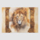 Die Aquarellmalerei weist einen majestätischen Löwen mit einem regalen und intensiven Blick auf, der von verzierten goldenen filigranen Mustern auf beiden Seiten gerahmt ist. Das Löwenmane fügt sich in den weichen, ätherischen Hintergrund ein und schafft ein Gefühl von Tiefe und Wärme. Der goldene Rahmen fügt ein Element von Eleganz und Grandeur hinzu, das die starke Präsenz des Löwen in der Mitte ergänzt. Die Gesamtkomposition ruft ein Gefühl von Stärke und Adel hervor.