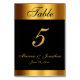 Diese elegante personalisierte Hochzeitskarte bietet die Tischnummer in Imitaten goldene Schrift-Kalligraphie mit den Namen von Braut und Jungzimmern und das Hochzeitsdatum auf einem schwarzen Hintergrund, umgeben von glänzendem Gold. Entworfen von Susan Coffey.
