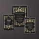 Glam, Vintag Art Deco Great Gatsby Stil Design. Es zeichnet sich durch Art-Déco-Stil mit Imitaten Goldfolie-Overlay, Ziergegenständen und Trennwänden, prächtigen Vintagen Schriftart aus. Verwenden Sie das Tool Anpassen, um Ihre Informationen hinzuzufügen. Für passende Artikel besuchen Sie bitte meine Glam Royal Gold Black Collection.