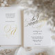 Diese exquisite Hochzeitseinladung besticht durch ein edles goldfarbenes Kalligraphiedesign auf einem knalligen weißen Hintergrund, das Eleganz und zeitlosen Charme ausstrahlt. Das wunderschön fließende Drehbuch fügt eine elegante Touch hinzu, die sich perfekt für formelle und luxuriöse Hochzeiten eignet. Der klassische Serif-Schriftart ergänzt die Goldtypografie und schafft so eine ausgewogene und polierte Ästhetik. Die Rückseite der Einladung beinhaltet ein stylisches @ monogram Detail und eine Online-UAWG, sodass die Gäste leicht Zugang zu den Hochzeitsdetails über den bereitgestellten Website-Link. Dieses minimalistische, aber opulente Design Anzug eine Vielzahl von Hochzeitsthemen, von modern und elegant bis Vintag und traditionell. Diese Einladung ist vollständig anpassbar und in hochwertigen Papierveredelungen inklusive Matte, Leinen und Perlenschimmer erhältlich. So wird ein luxuriöses Ambiente für Ihren besonderen Tag garantiert.