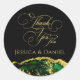 Herrliche und luxuriöse, abstrakte Alkohol Tinte Hochzeit danke Ihnen Aufkleber. Deluxe smaragdgrün, schwarz und gold mit einem schicken Script-Schriftart. Bearbeiten Sie die Vorlage einfach auf die Namen der Braut und des Bräutigams. Originelle Kunst aus Alkoholfarbe von der internationalen Künstlerin Pauline Benjes. Luxuriöse Emerald Green Gold Custom Classic Round Sticker.