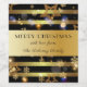 Personalisiertes Weinetikett mit glänzenden Schneeflocken und Sternen auf goldfarbenem und schwarz gestreiftem Hintergrund mit einem Bereich für Ihren Text.