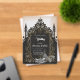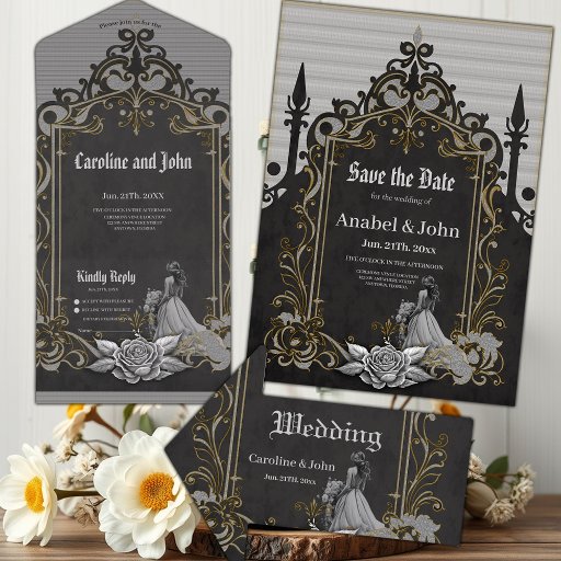 Luxus trifft Romantik. Ein kunstvoll gestalteter schwarzer, silberner goldfarbener Rahmen mit fein-filigranen Dekorationen. Diese liebevollen Details geben dem Design eine opulente Touch und umgeben den Betrachter mit einem Gefühl festlicher Vorfreude. Innerhalb dieses magischen Rahmens offenbart sich eine Frau in einem atemberaubenden Hochzeitskleid. Das Design strahlt eine Aura der Exklusivität und Wärme aus