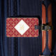 Ein Luxusrot und ein Gold vier Punkt quatre Blumenmuster-Gepäckumbau, der personalisiert sein kann, indem es Ihr Monogramm addiert. Dieser elegante Vintage mit Monogramm Damastentwurf ist sicher, Ihre hoch entwickelte Seite herauszubringen. Ebenedruckbild, nicht metallisch.