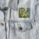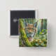 Button zeigt ein grünes Luchs-Portrait. Die seltsame Wildkatze blickt direkt auf den Betrachter mit grünen Augen in diesem waldfarbenen Portrait. Ein lebendiges, felines Kunstwerk mit reichhaltigem Blätterdach.