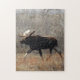 Stier-Elch-Puzzlespiel. Ein Stierelch holzt durch die Scheuerbürste in einem Sandhügelbereich von südöstlichem Alberta, Kanada ab. Elche scheinen aus Platz in diesem trockenen, sandigen Gelände heraus, das das sehr kleine Wasser hat, zum der Wasservegetationselche zu stützen füttern normalerweise an.