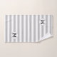 Elegantes Handtuchhandtuch mit M-Set mit silbergrauen und weißen Streifen im Hintergrund. Modernes Set für Handtuch.