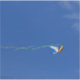 Ein Foto eines bunten Riesenvogel-Drachen mit Bändern, die aus seinen Flügeln im Wind schweben und im sommerlichen blauen Himmel hoch fliegen. Copyright © Kimberly J Tilley.